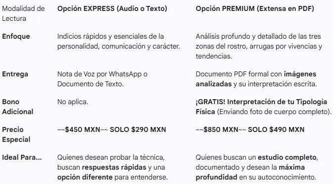 En Grafos y Rostros, creemos que la información profunda debe ser accesible. Por eso, hemos creado dos modalidades de Lectura de Rostro que se adaptan a tu curiosidad y presupuesto, revelando cómo tus experiencias han moldeado tus facciones y tu personalidad.